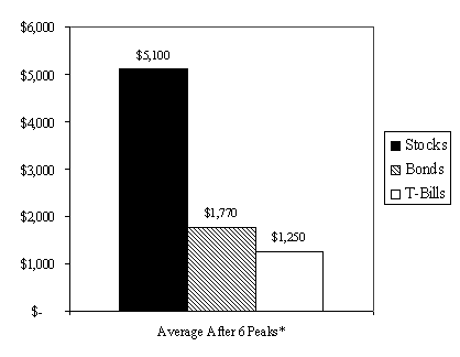 Given the widespread fear that we are currently at or near a market peak, Siegel provides one more important piece of data: Had one been unfortunate enough to invest $1,000 in stocks just before the six worst market crashes this century, one's long-term returns would still have prevailed strongly over bonds and T-bills, as the following chart shows: